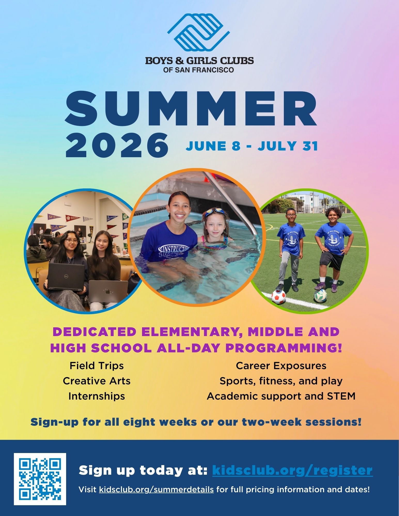 Our School-Based Clubs at San Francisco Community School, Malcolm X Academy, Bayshore School, and Carver Elementary School will also be open for 8 weeks of summer programming and you can sign up now. The exact schedule for which weeks will be located within the school and which weeks will be located at the closest Clubhouse (our Excelsior Clubhouse for San Francisco Community School and our Willie Mays Clubhouse at Hunters Point for Malcolm X Academy, and Carver Elementary School) will be available in March. Please reach out to your Site Director for more information.
